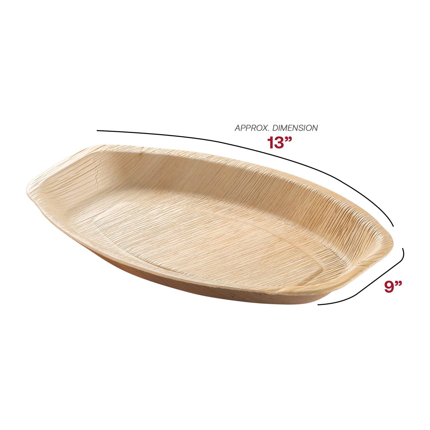 These 9" x 13" Oval Natural Palm Leaf Disposable Eco-Friendly Trays are environmentally friendly. The palm leaves used to make them are sourced from leaves that have already fallen and are then cleaned and pressed into these trays. Since they are all-natural, they are compostable and biodegradable, so they are safer for the environment and have no binders or chemicals. Even though they are made from natural palm leaves, they are as durable as any disposable plastic plate and won't bend or buckle under the food's weight. They measure 9 inches by 13 inches, offering plenty of room for what is being served. In addition, they are oven safe and approved by the FDA.