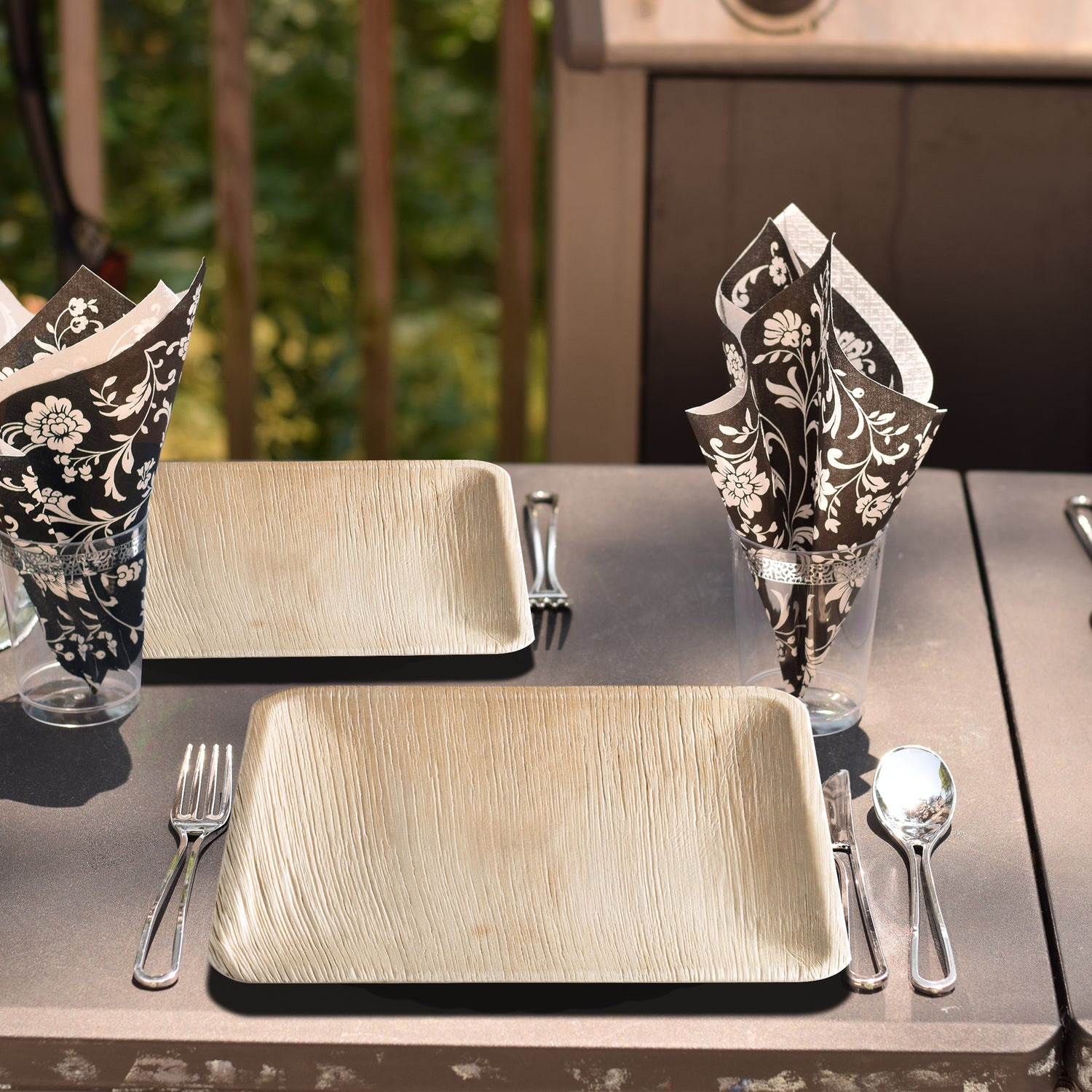 Keep guests entertained with a fun and memorable table setting. Made using traditional techniques of manipulating and pressing naturally fallen palm leaves, these platters present a fascinating range of biodegradable and compostable partyware. Additionally, these premium disposable platters are lightweight yet so strong that they can hold up to 20 times their own weight, and they are break and leak-resistant, microwave-safe on high for 2 minutes, and oven-safe up to 350F for 45 minutes.