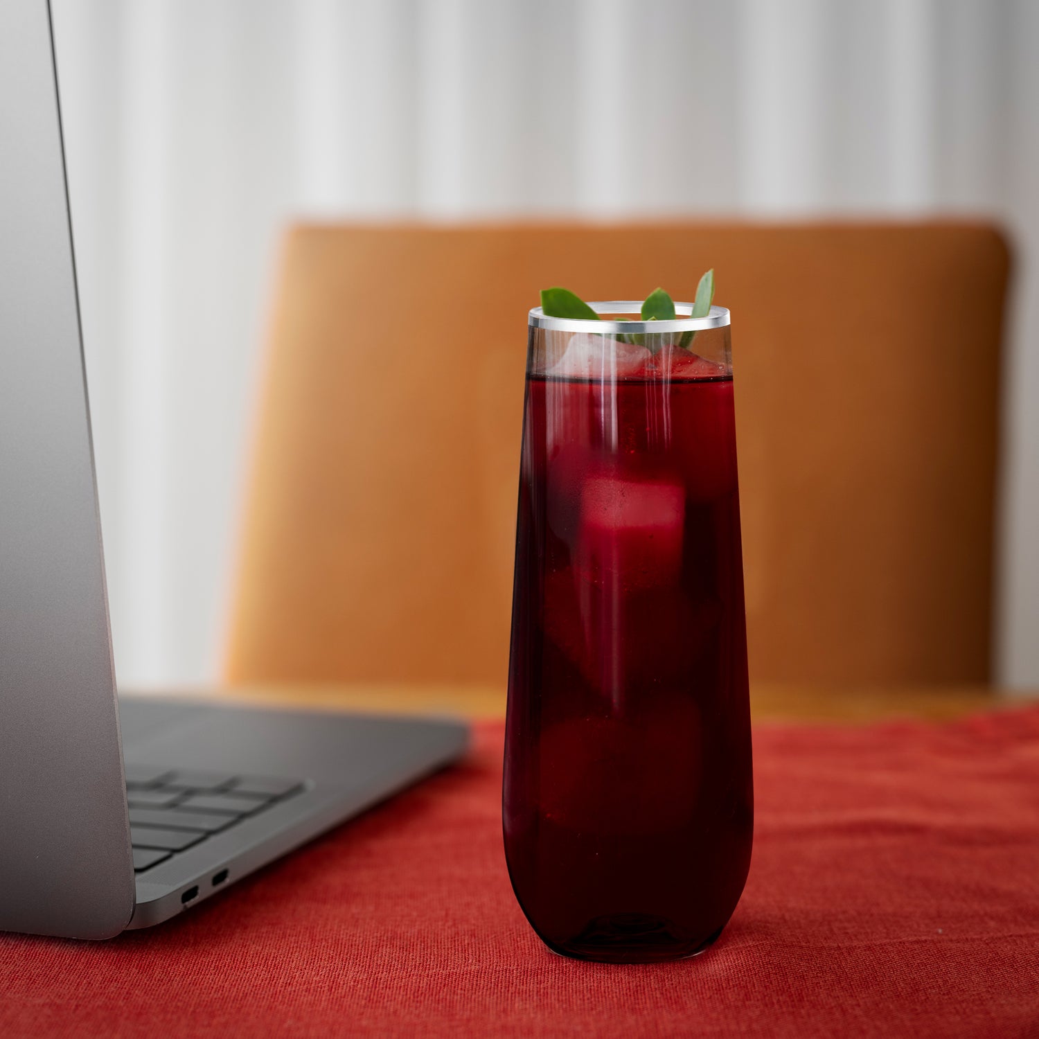 The silver rims of these champagne flutes add a unique and eye-catching element to the overall design. The metallic finish enhances the visual appeal and brings a touch of glamour to your toasts and celebrations. The absence of a traditional stem contributes to the modern aesthetic, creating a sleek and streamlined profile that feels contemporary and on-trend.