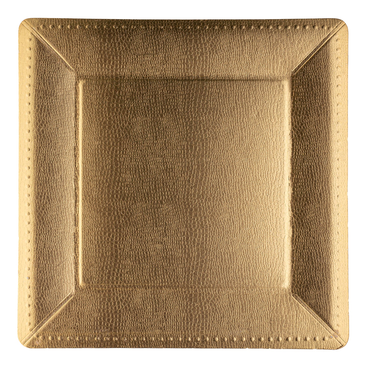 Set an elegant dinner table without breaking the budget when you use the 13" Gold Square Edge Beaded Paper Disposable Charger Plates. These sophisticated charger plates feature a shimmery golden hue that catches the light and adds a bit of opulence to any fancy occasion, including wedding receptions, birthday parties, baby showers, bridal bashes, holiday feasts, and professionally catered events. The plates' outside edges are small beaded details that give them an old-fashioned appearance. In addition, the design features a 2.25-inch outer rim that further draws attention to the details along the edges. These sophisticated-looking plates are disposable, so you don't have to waste time washing them at the night's end.