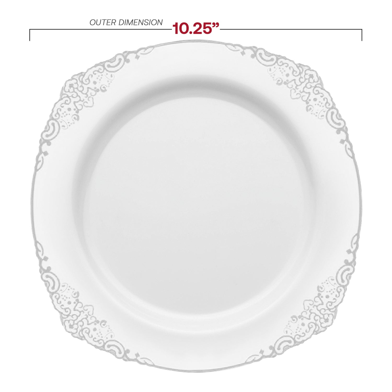 White with Silver Fancy Round Plastic Dinner Plates (10.25”)