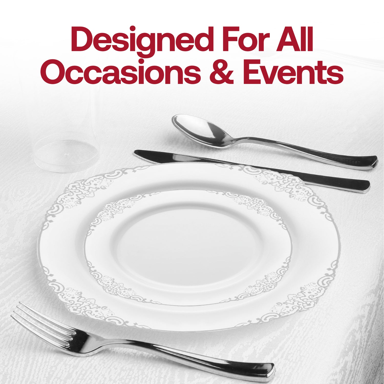 Simplify your events with our fancy White with Silver Disposable Plastic Dinner Plates. These elegant 10.25-inch plates bring a touch of sophistication to any event, combining the convenience of disposable tableware with the glamour of fine dining. Crafted from durable plastic, these plates offer a sturdy foundation for culinary creations. The pristine white base provides a classic canvas, while the intricate silver rim adds luxury. This tasteful design seamlessly blends with various table settings, making it perfect for weddings, anniversaries, holiday parties, or upscale corporate events.