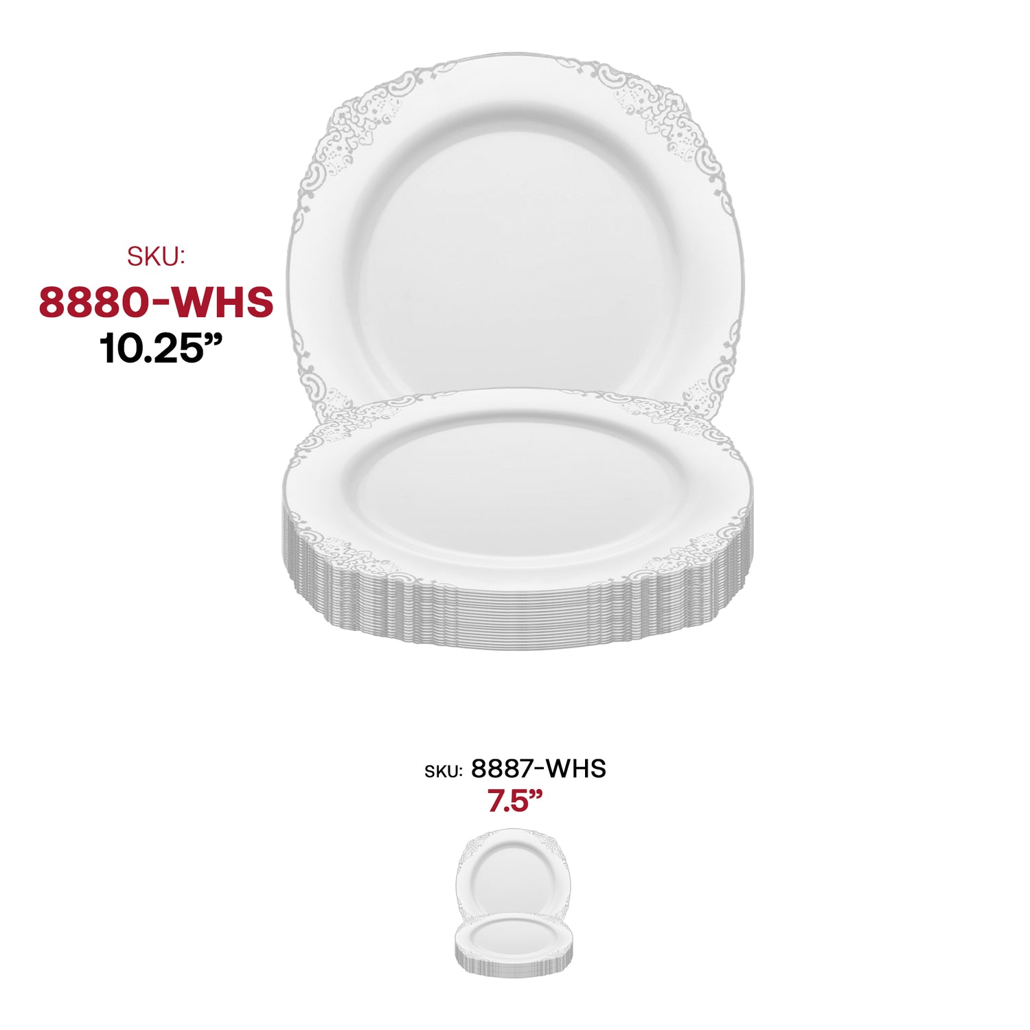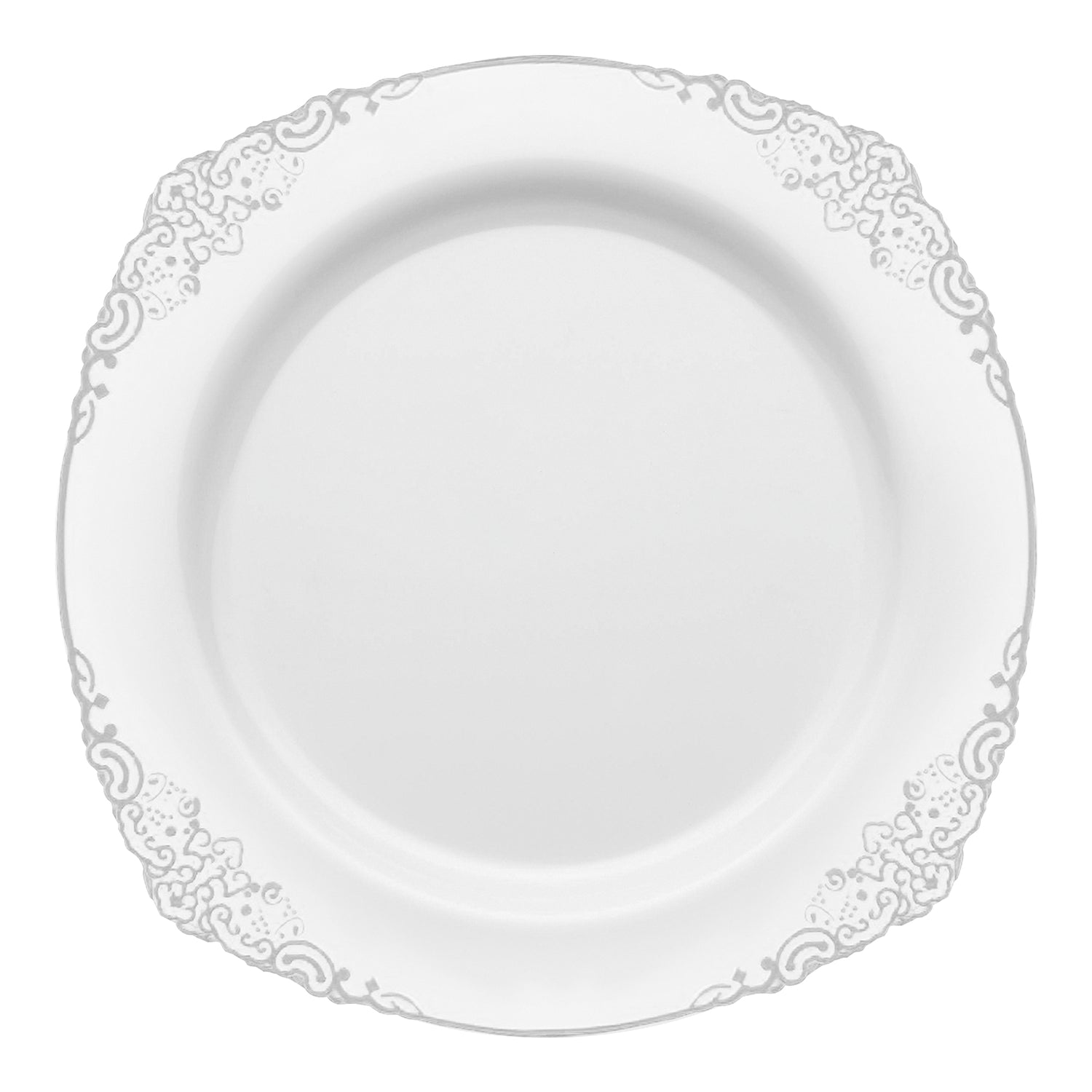 • White with Silver Fancy Round Plastic Dinner Plates (10.25”)