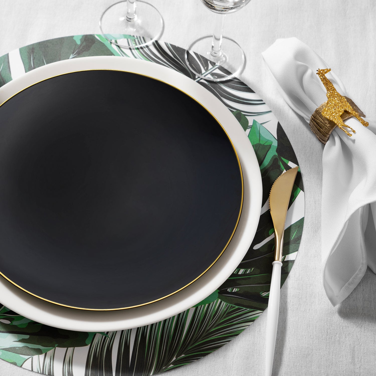 The culinary delights you prepared with love will never look more appealing than when you present them on these lovely salad plates. Whether you're serving a wedding party dinner or a birthday feast, these gorgeous plastic plates will charm all your party guests! These beautiful black organic salad plates are adorned with gold edges along the rims, making them an excellent choice for both casual family dining and fancy entertaining.