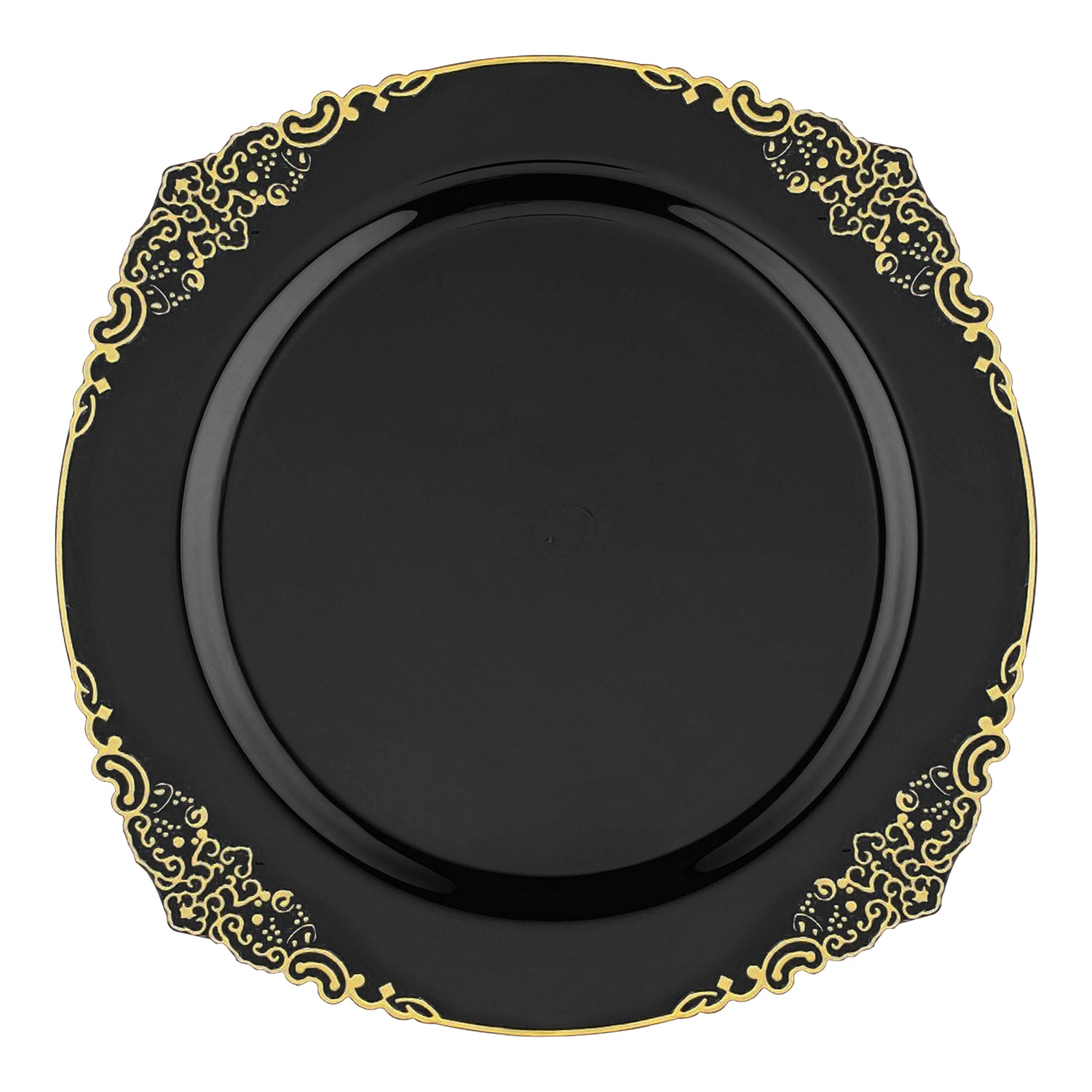 Black with Gold Fancy Round Plastic Salad Plates (7.5”)