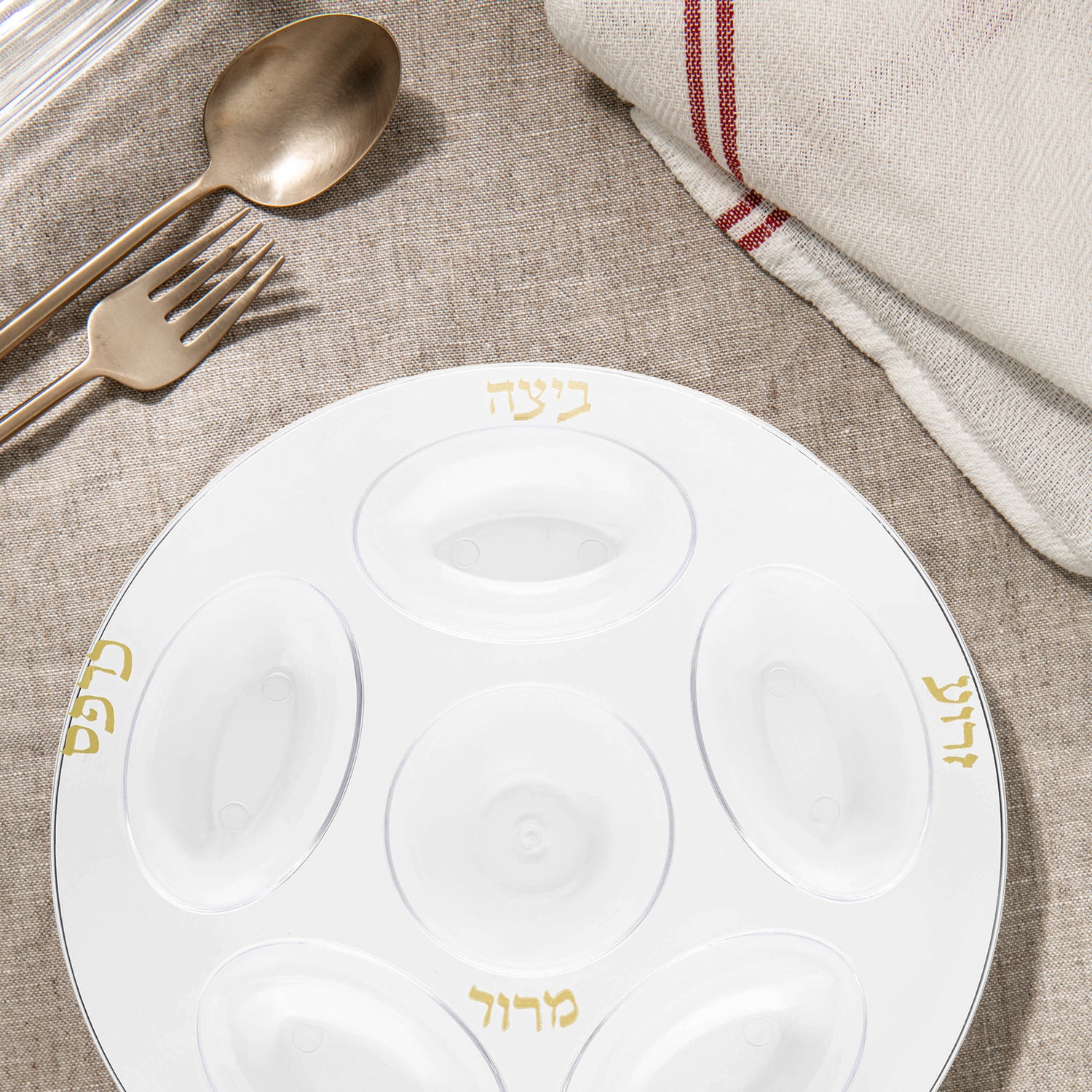 The transparent plastic material of these plates allows for easy viewing of the food items, while the gold color adds a touch of elegance and sophistication to the table setting. The size of the plates is ideal for a full Seder meal, and the sections ensure that each food item remains separate and distinct.