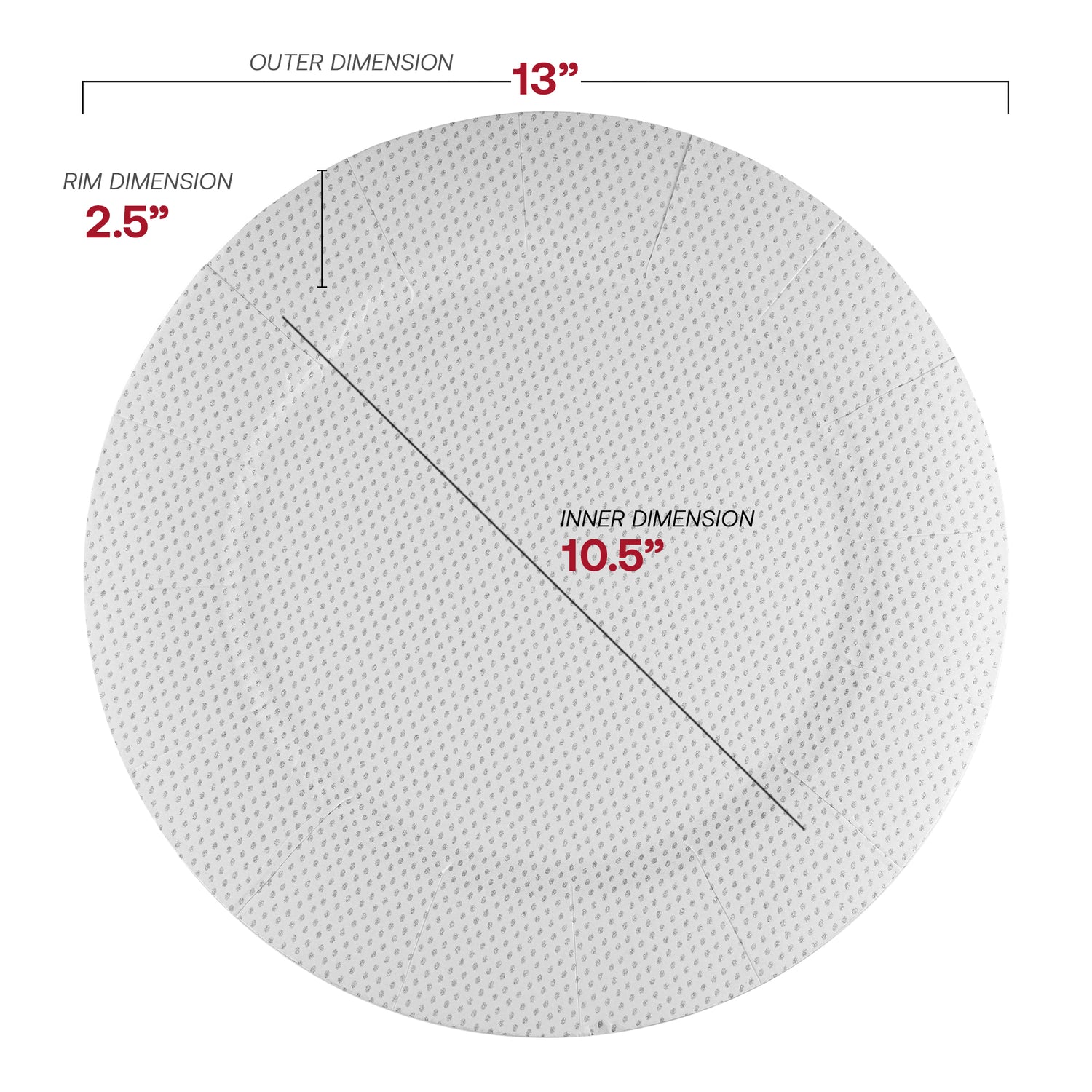 Measuring 13 inches in diameter, these round charger plates are designed to accommodate standard-sized dinner plates and provide a stunning framing effect. Whether you're hosting a wedding reception, anniversary celebration, or upscale dinner party, these charger plates elevate your table setting to new heights of elegance. Their larger size allows for a generous serving space, making them perfect for multi-course meals or elaborate buffet spreads.