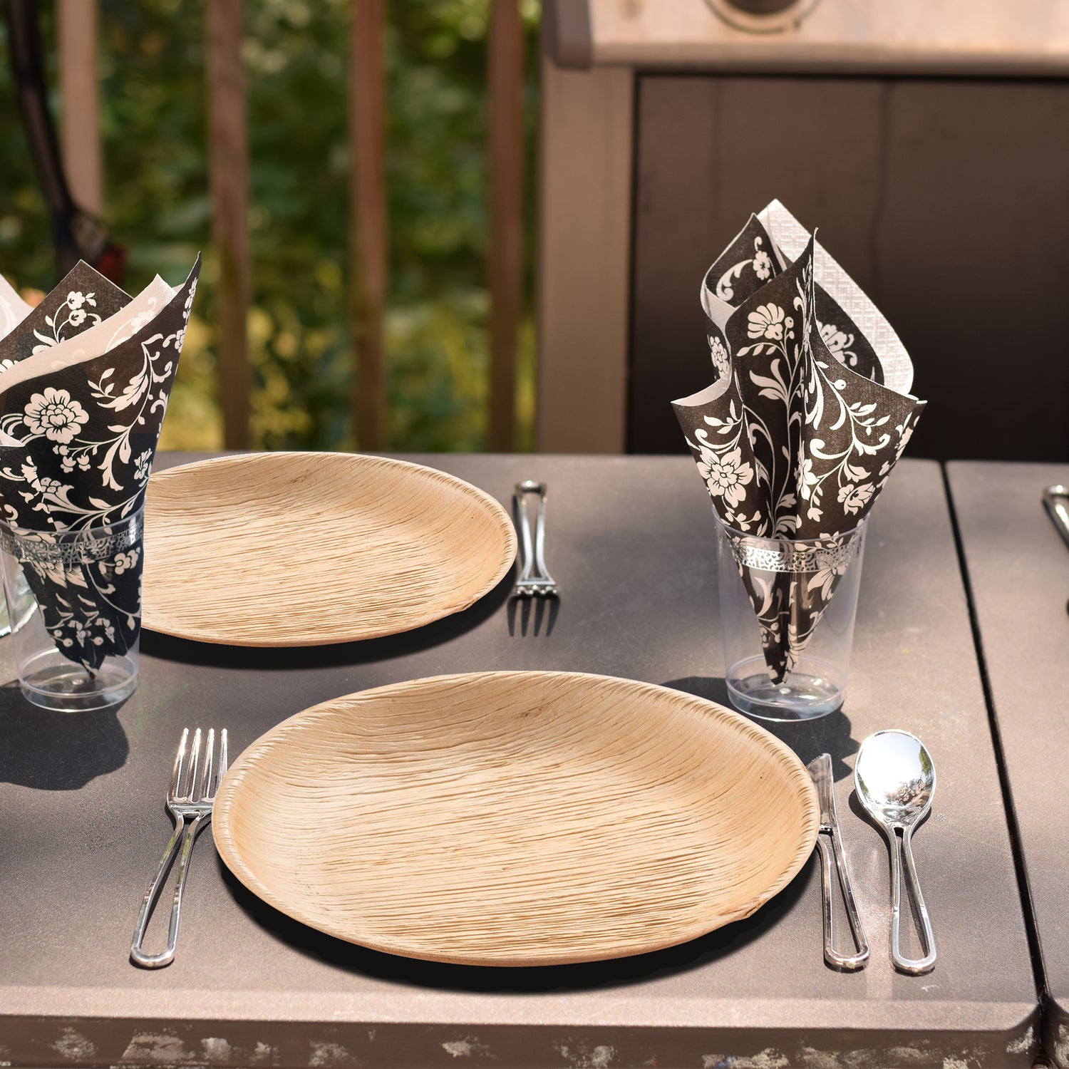 Another advantage of these plates is their attractive appearance. The natural, organic texture of the palm leaf material gives each plate a unique look, adding a touch of style and elegance to any table setting. They are perfect for use at weddings, parties, or other special events where aesthetics are essential.