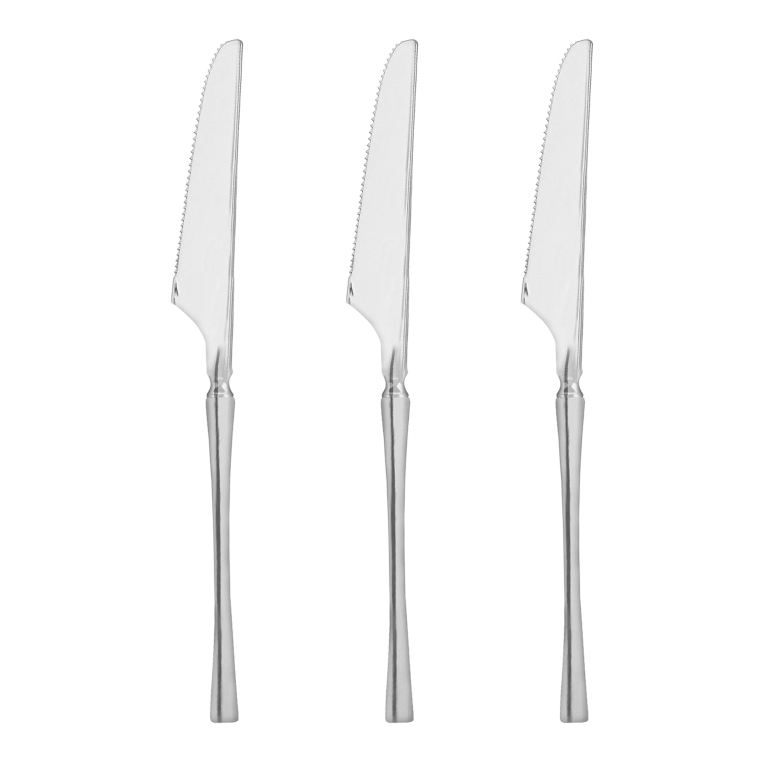 These shiny silver knives are versatile and suitable for any table setting. Whether you're hosting a casual brunch or an elegant formal dinner, they seamlessly blend with any décor, adding a touch of sophistication to your event. In addition, the shiny silver finish is resistant to fading or tarnishing, ensuring that these knives maintain their attractive appearance throughout the event.