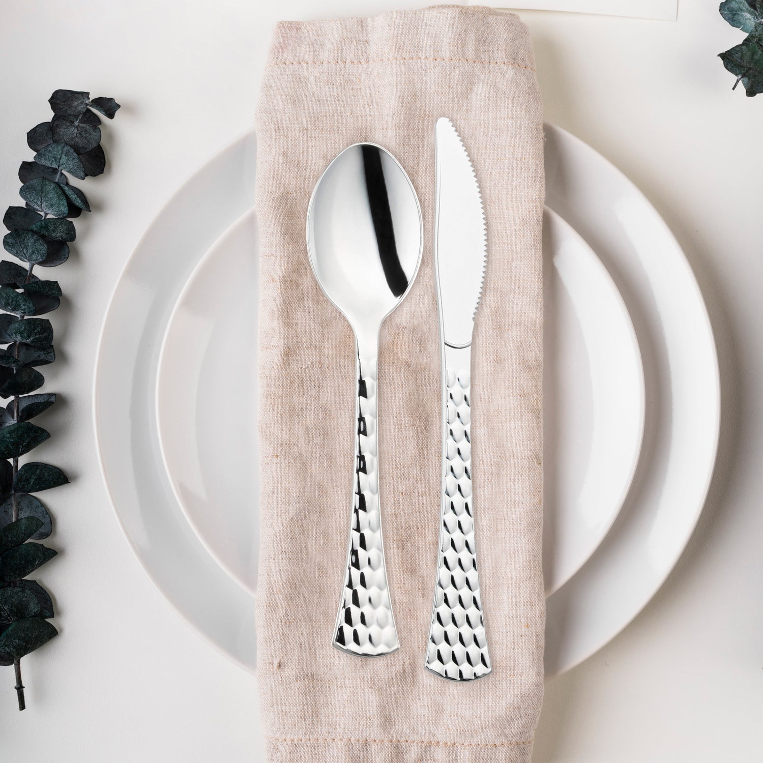 When setting a fancy table at a formal event, even the type of flatware matters. With traditional spoons, you get the appeal of a metallic sheen but are left with many cleanups after the party. Even though many are reluctant to use disposable flatware as they often do not have the appearance that the setting requires. But with the Shiny Silver Glamour Disposable Plastic Spoons, you can enjoy the appearance of traditional flatware while also getting all of the convenience of disposable tableware instead.