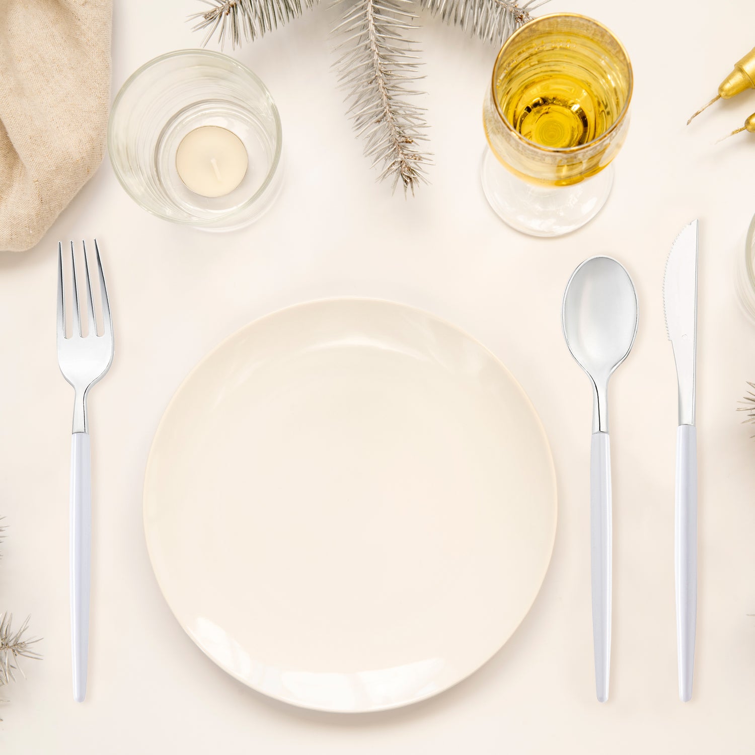 Shiny Silver with White Handle Moderno Disposable Plastic Dinner Forks