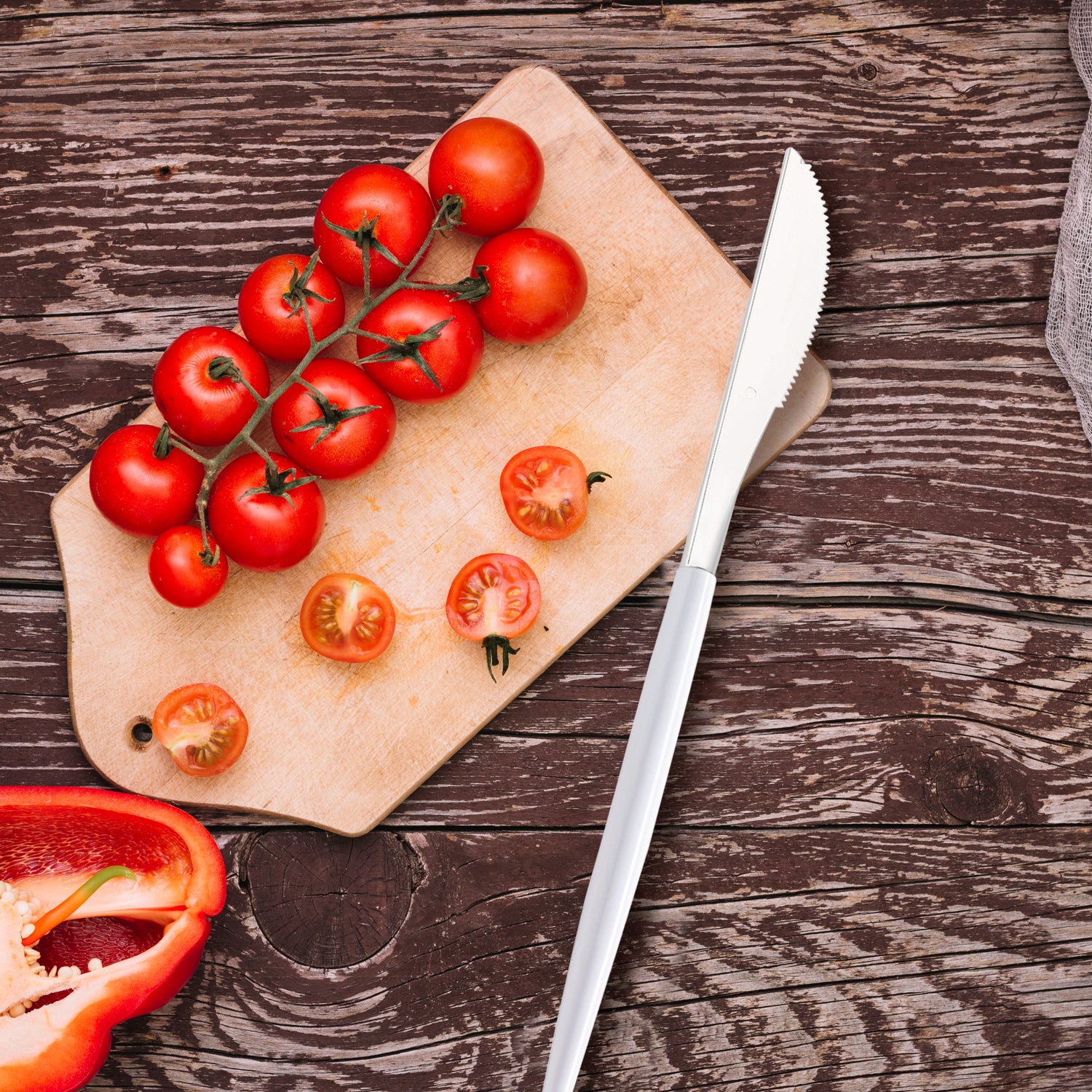 The silver color of the knife blades exudes a sense of timeless elegance. It pairs beautifully with the white handles, creating a striking contrast that complements any table decor. So whether you're hosting a chic dinner party or an intimate wedding reception, these knives will effortlessly elevate your table setting and leave a lasting impression on your guests. Not only do these disposable knives offer aesthetic appeal, but they also boast exceptional functionality. The serrated edges of the blades ensure smooth and precise cutting, making them suitable for a wide range of culinary delights. From slicing through succulent steaks to effortlessly spreading butter on warm bread, these knives deliver the performance you would expect from traditional cutlery.