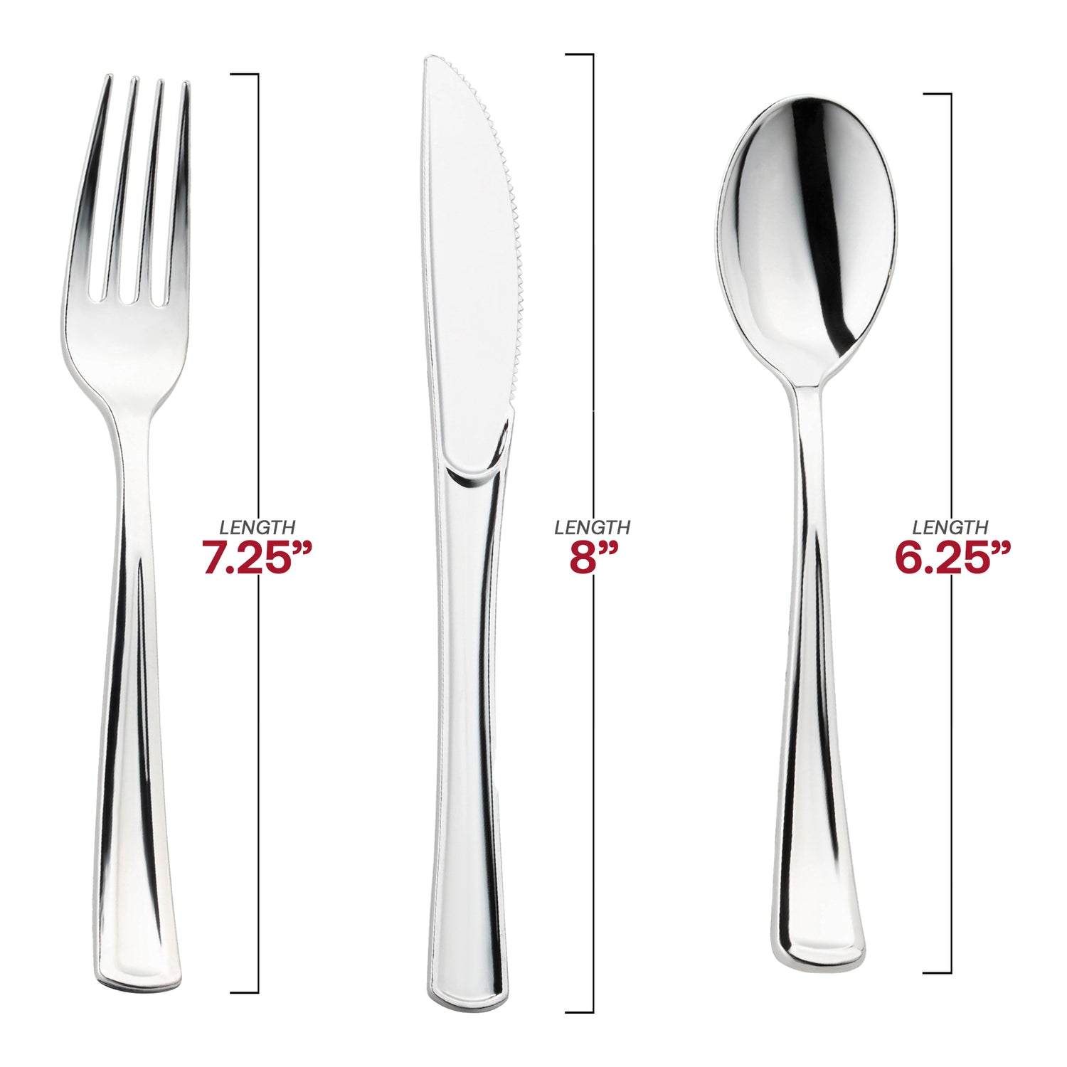 Are you looking to add some elegant sparkle to your next event? Look no further than this fabulous cutlery set! The shiny metallic silver cutlery set will add an air of pure luxury to your wedding reception, baby or bridal shower, birthday party, or any other formal event. This supreme disposable cutlery set is crafted from lightweight yet extra-sturdy, premium quality plastic, making them not only festive and luxurious but also incredibly functional and practical. Easy, beautiful, inexpensive, and genius!
