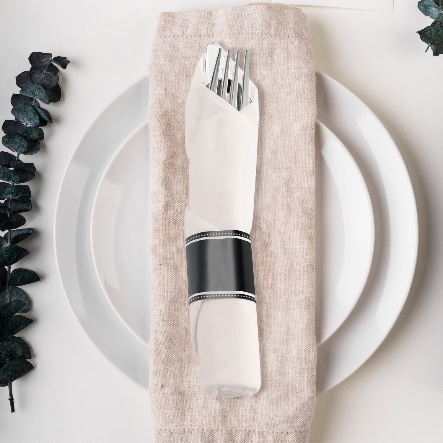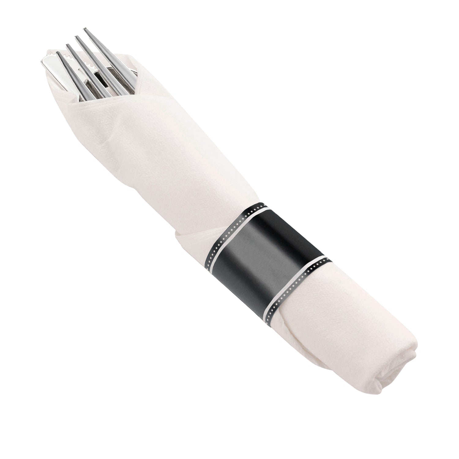 These napkin rolls are ideal for the table when you are hosting a party or dining with friends. This classy silver set is the perfect way to add an elegant touch to your party. For a special occasion, have a beautiful and elegant table setting with this silver cutlery. Made and designed for upscale events, this cutlery set comes with complete dinnerware utensils, including spoons, knives, forks, white paper napkins, and black napkin rings.