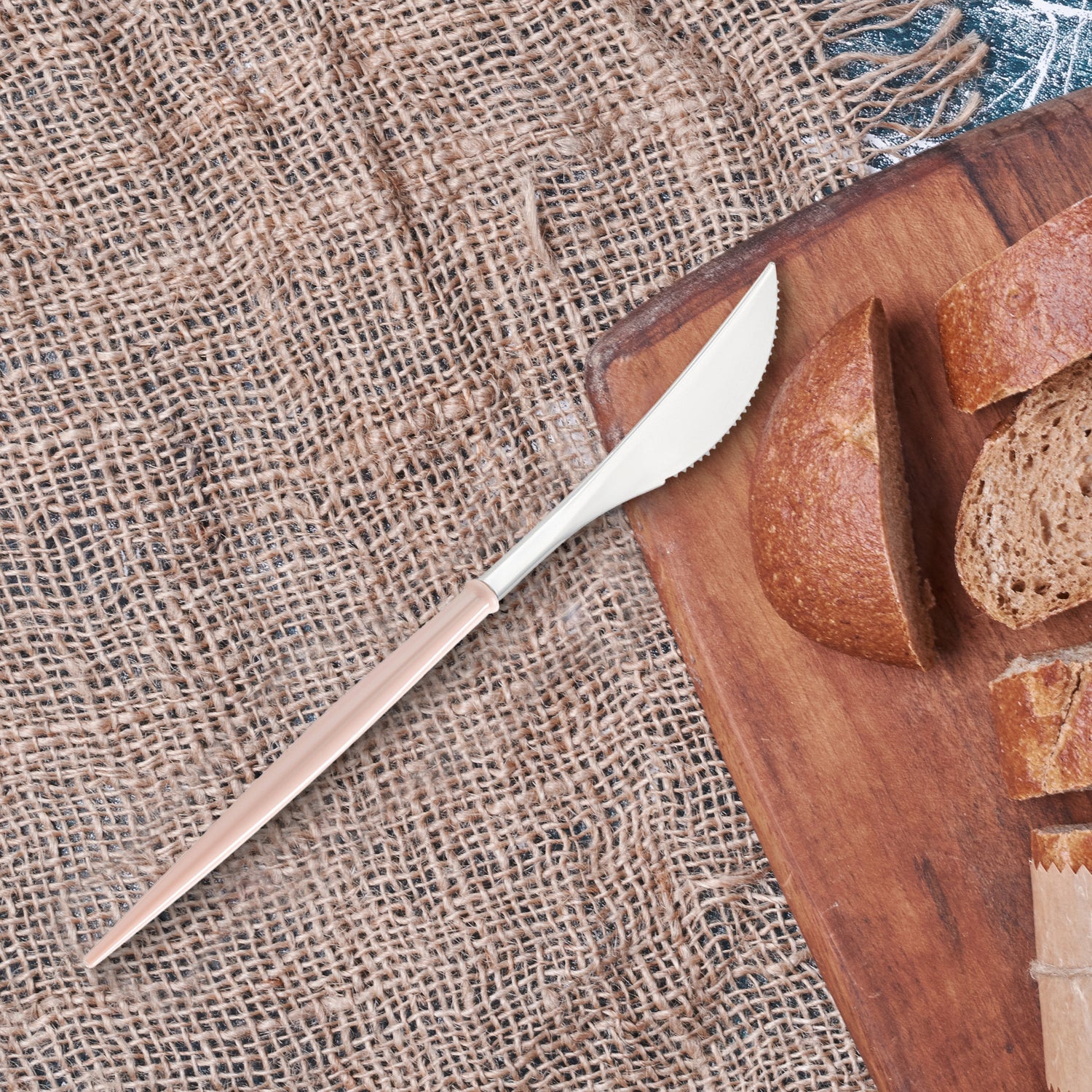 The sleek design of these premium plastic knives is perfect for those who want to add a touch of elegance and sophistication to their dining experience. The knife is silver in color with a beautiful pink handle, which adds a pop of color and makes it stand out on the table. The design is modern and stylish, making them perfect for any occasion, whether a wedding, birthday party, or other celebration.