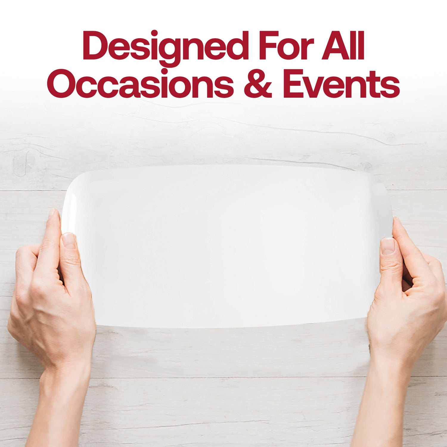 The rectangular shape of these exquisite disposable plastic plates adds a modern touch to any event, and their solid white color provides a clean and classic look that will match any decor. These fancy plastic plates suit wedding receptions, professionally catered events, baby showers, engagement ceremonies, anniversary celebrations, holiday feasts, birthdays, bridal bashes, family gatherings, and more.