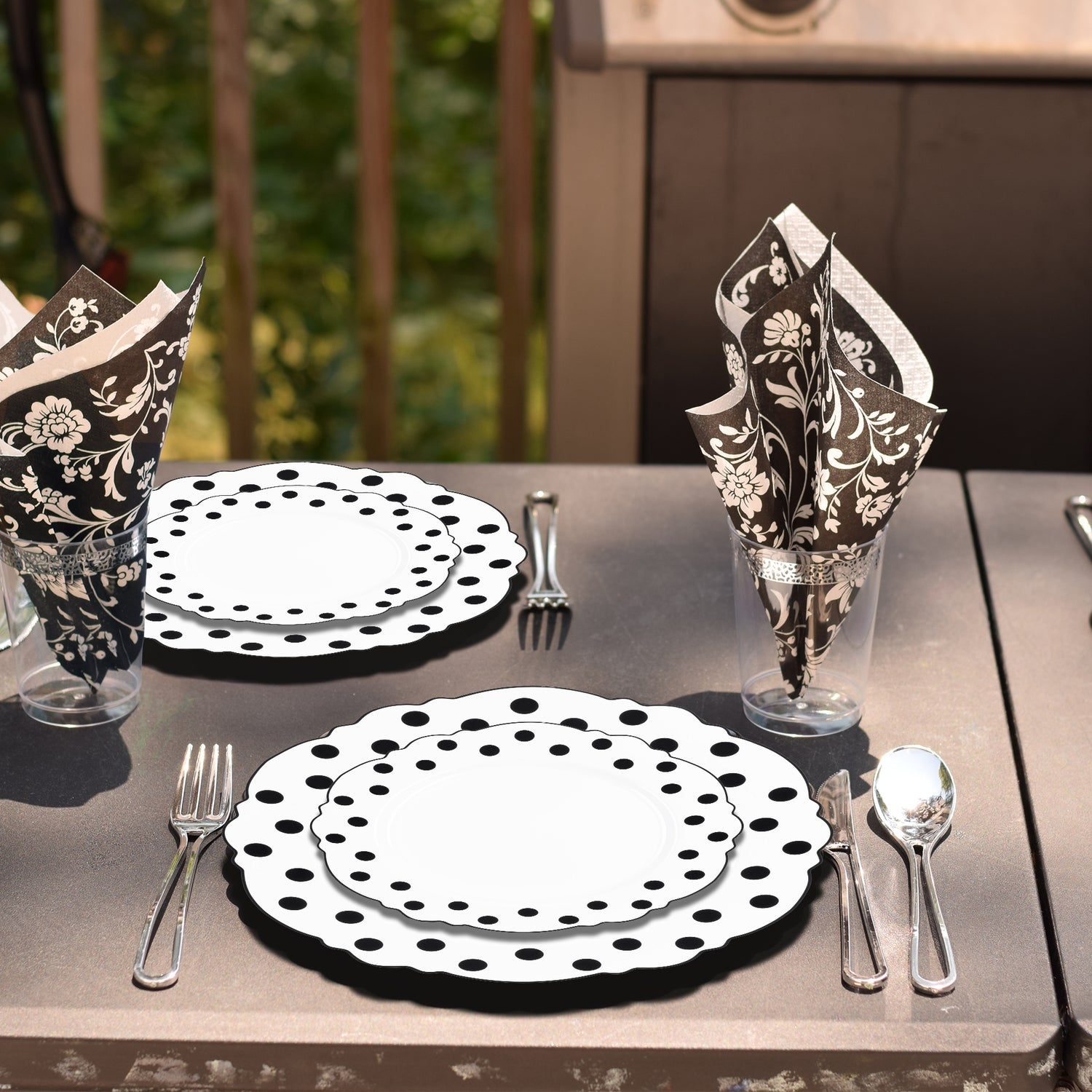 Design, decorate, and beautify your table setting with help from these super adorable white salad plates adorned with lovely black dots set on blossom edges. With the exceptional combination of premium quality plastic construction, functionality, and beautiful appeal, these stylish salad plates are ideal for fancy celebrations like wedding receptions, birthday parties, baby or bridal showers, holiday feasts, and other important events.