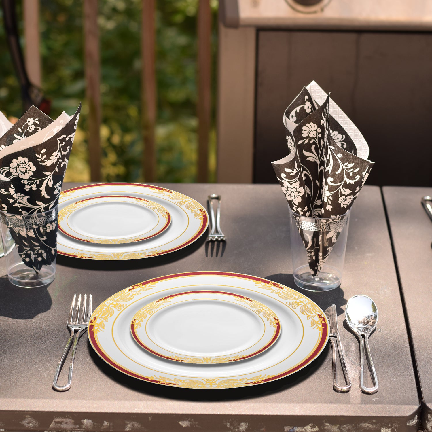 These 10.25" White with Burgundy and Gold Harmony Rim Disposable Plastic Dinner Plates are available for purchase in bulk, with 10 plates in every pack and 12 packs in every case, so you can quickly get enough for the entire party all in one place.