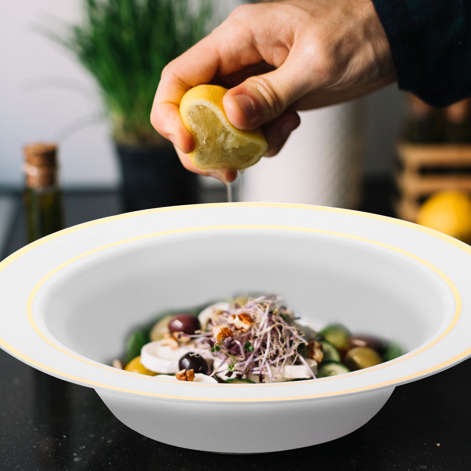 The perfect solution for entertaining your guests, these disposable bowls feature a classic white color embellished with shiny gold edges along the rims. Designed to be used once, they're an excellent way to bring convenience to your next meal. The plastic material is lightweight but durable, making them ideal for everyday use.