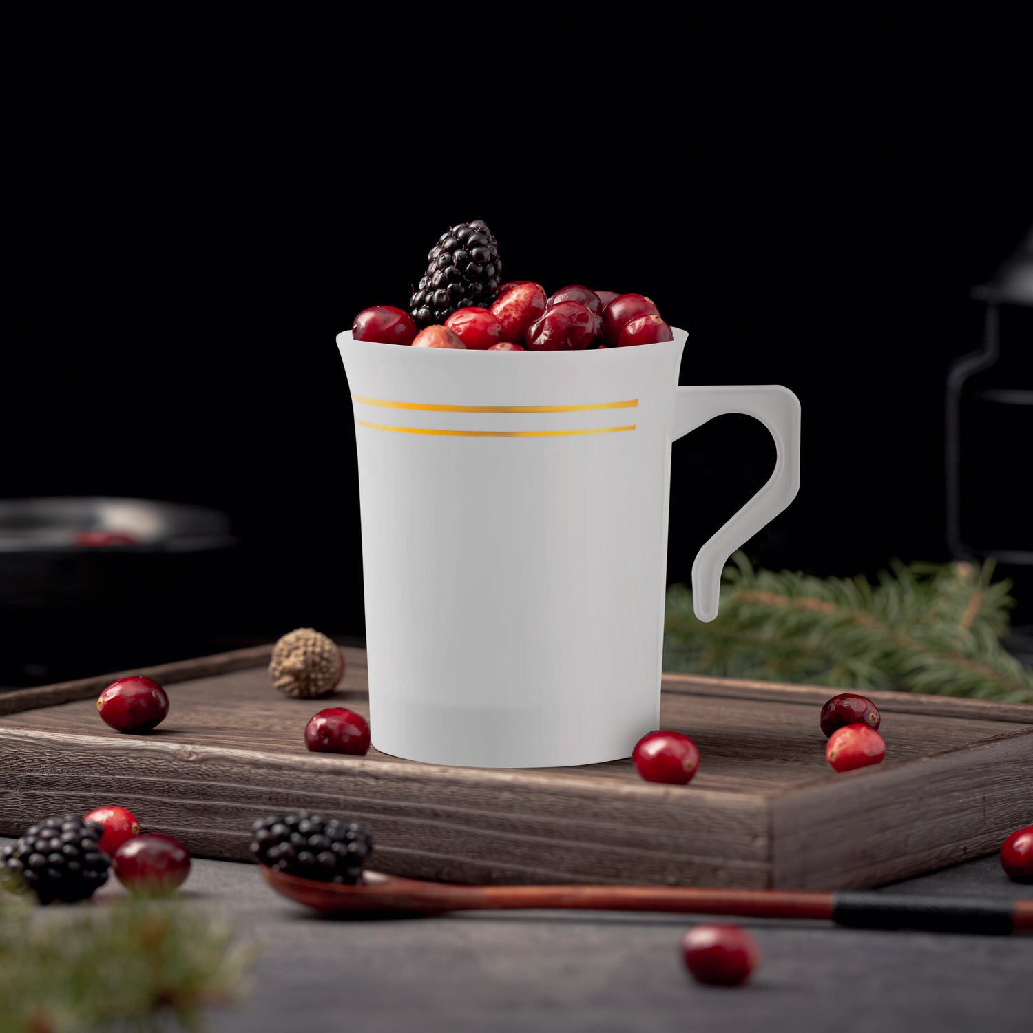 This environmentally friendly 8 oz. White with Gold Edge Rim Round Disposable Plastic Coffee Mug is crafted of the highest quality, recyclable plastic materials. Using these exquisite disposable cups ensures you won't be contributing more garbage to landfills like other plastic items do. They are also BPA-free, so they are safe for your guests to drink from them without exposure to any toxic chemicals.