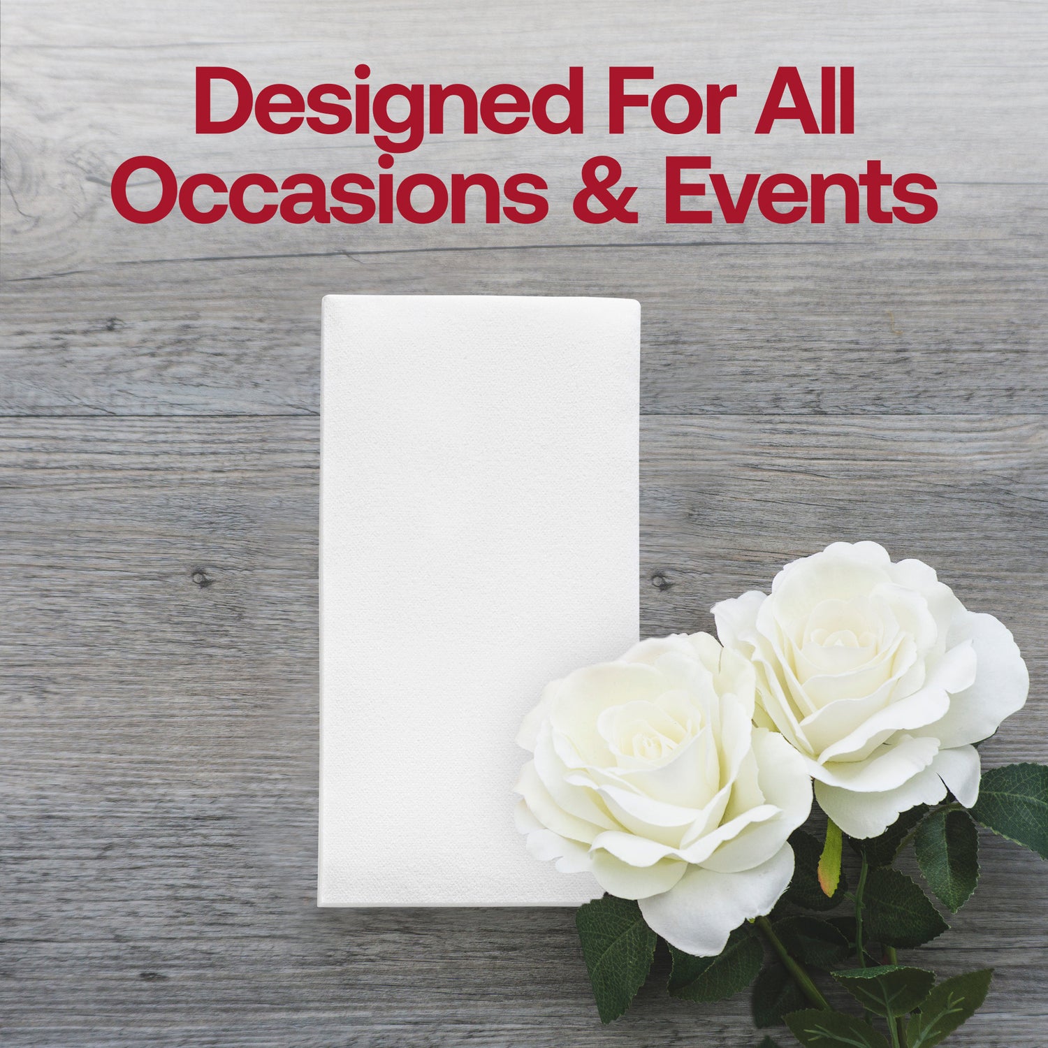 Crafted with meticulous attention to detail, these napkins are designed to mimic linen's elegance and luxurious feel. Made from high-quality premium paper, they combine practicality with a touch of opulence, providing the perfect balance for formal and casual gatherings. With a crisp white color, these napkins exude cleanliness and purity, instantly elevating the visual appeal of your tablescape.