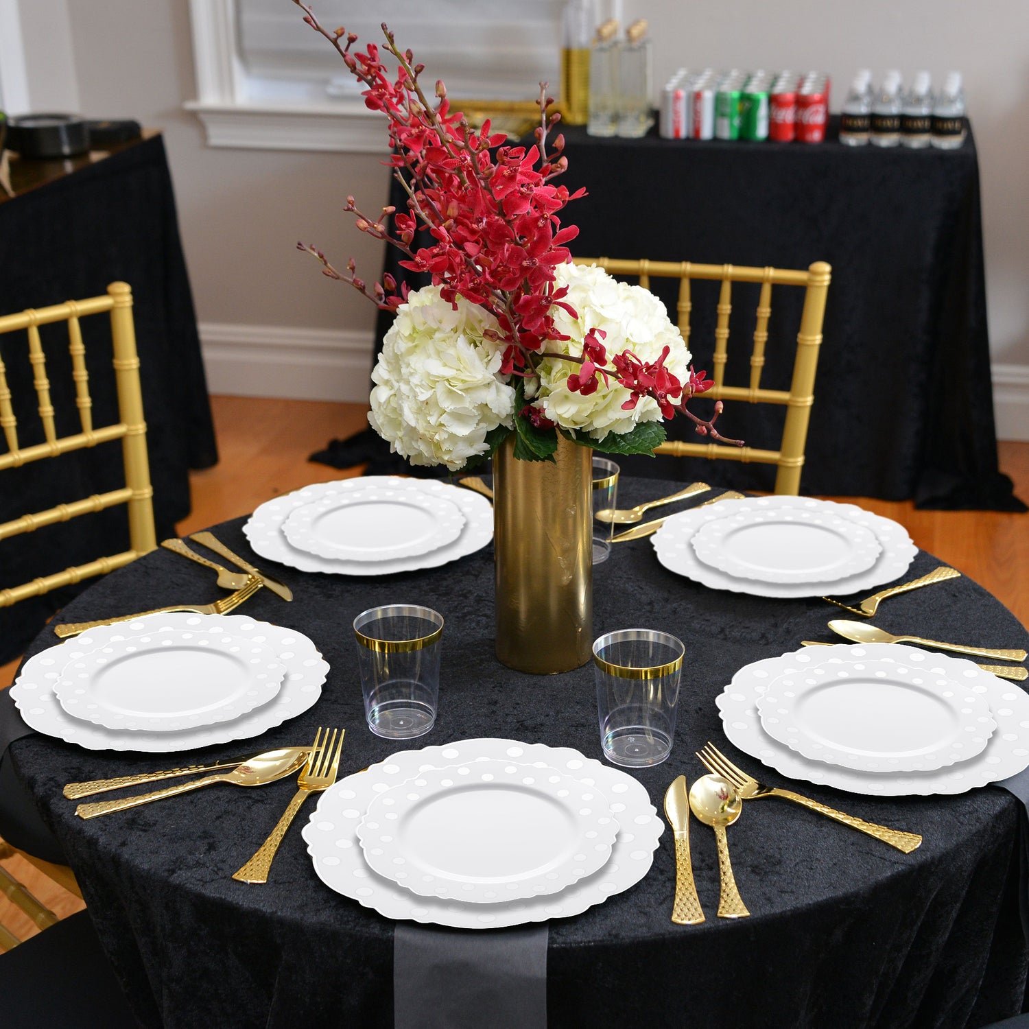 Make your next wedding reception, baby shower, bridal bash, catered event, or birthday party look spectacular with these elegant plastic dinner plates. Shiny silver dots embellish the fabulous blossom rims of these lovely white plates, making them perfect for adding a touch of sophisticated style to the table decor. Plus, they are disposable, so forget about after-party cleaning up.