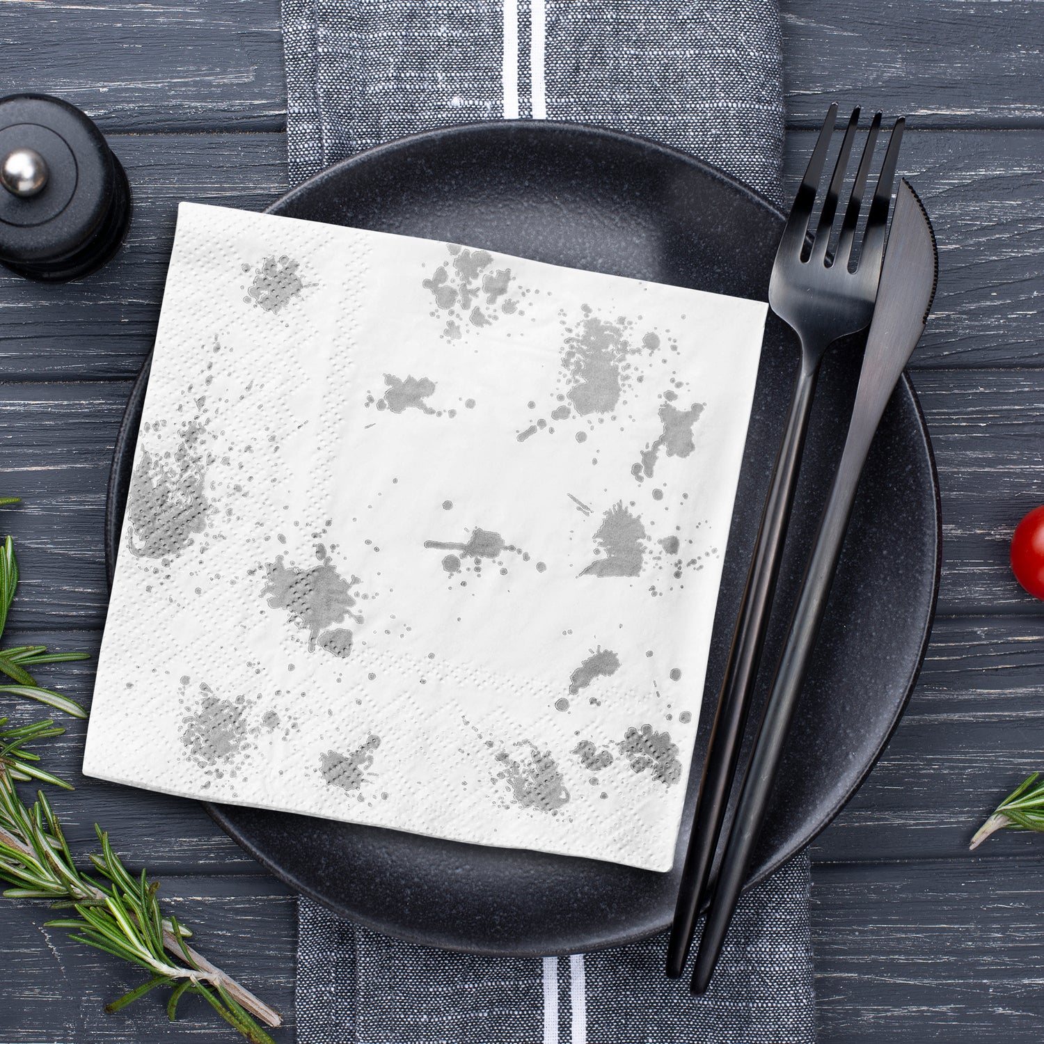 Whether serving a classic martini, a refreshing fruit punch, or an assortment of hors d'oeuvres, these napkins elevate the overall drinking and dining experience. The silver paint splatters catch the light, creating a subtle shimmer that catches the eye and adds a touch of glamour to the occasion. Guests will surely appreciate the attention to detail and the seamless blend of style and substance these napkins bring.