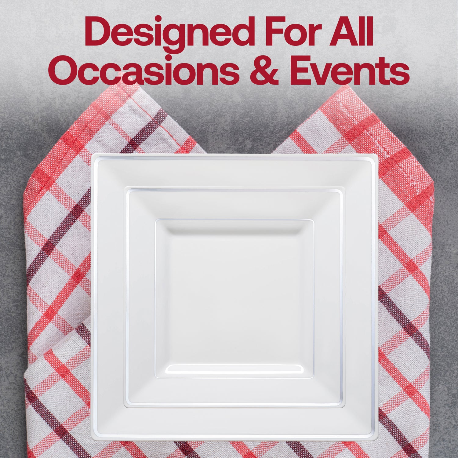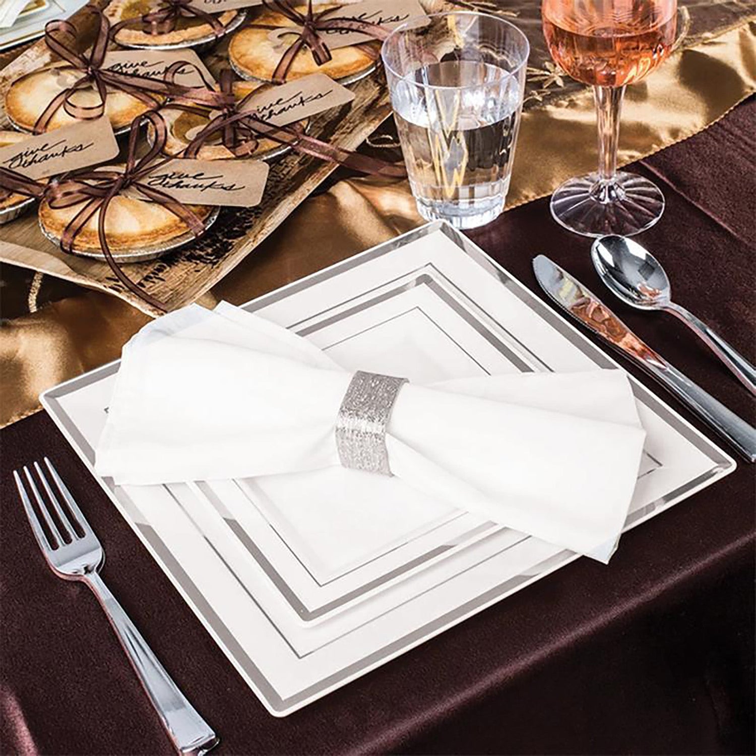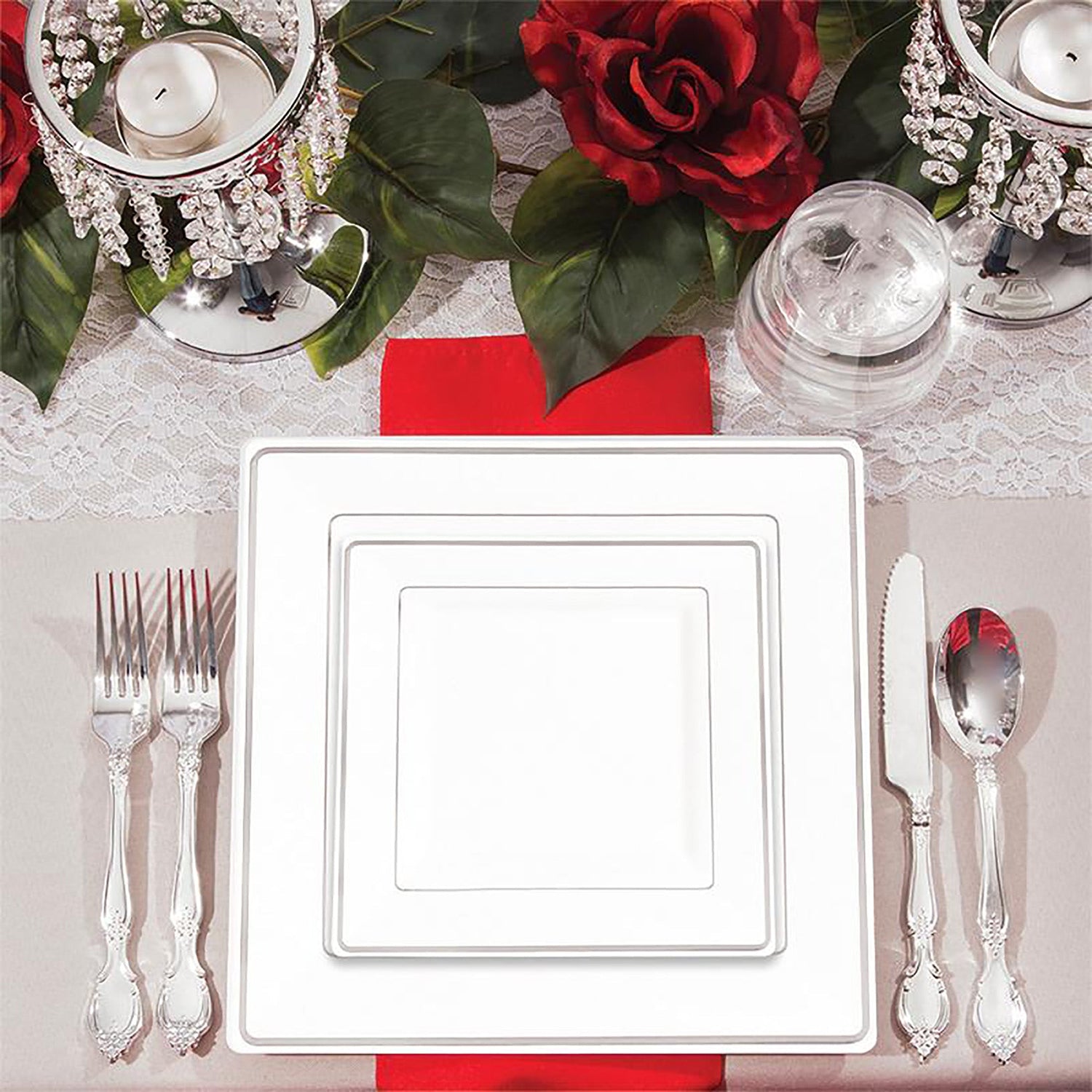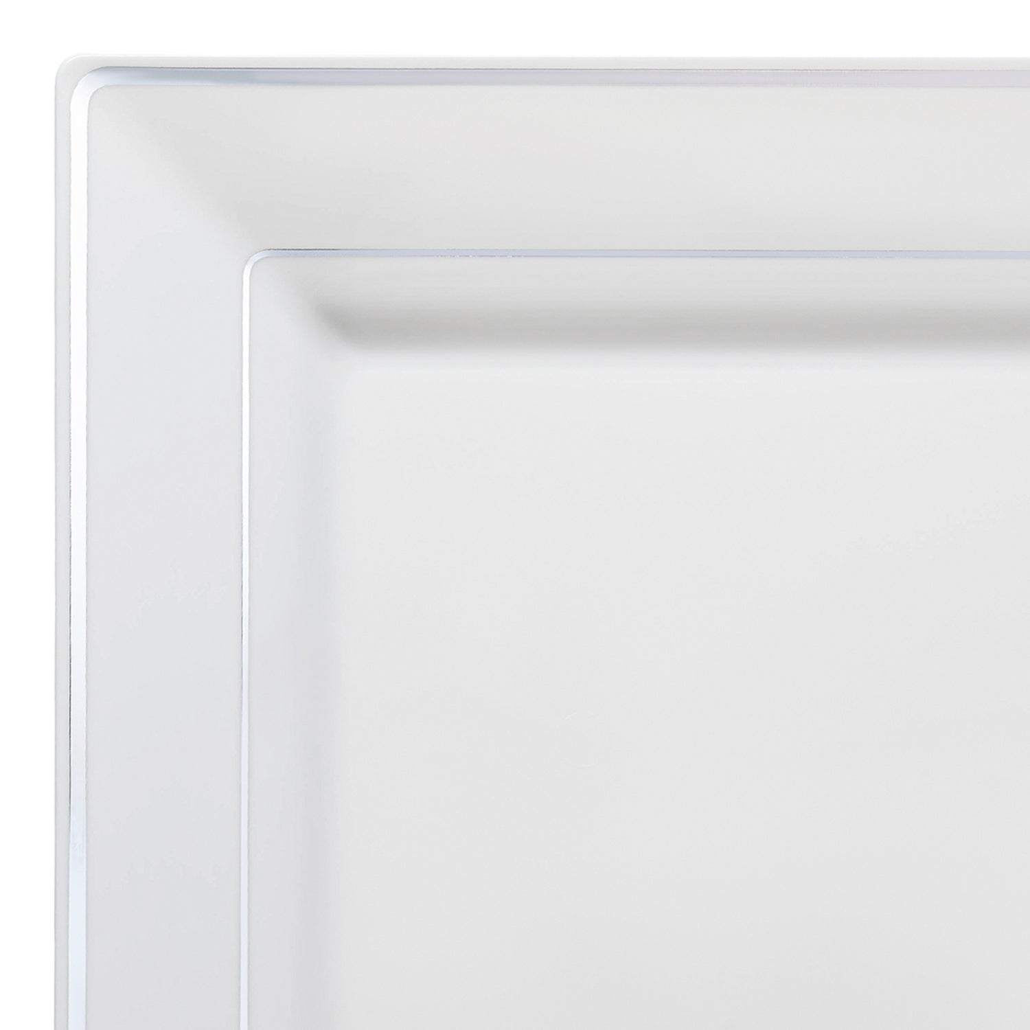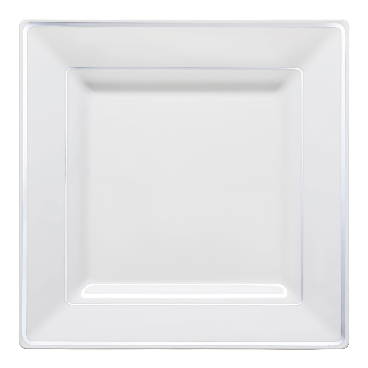White with Silver Square Edge Rim Disposable Plastic Dinner Plates (9.5")