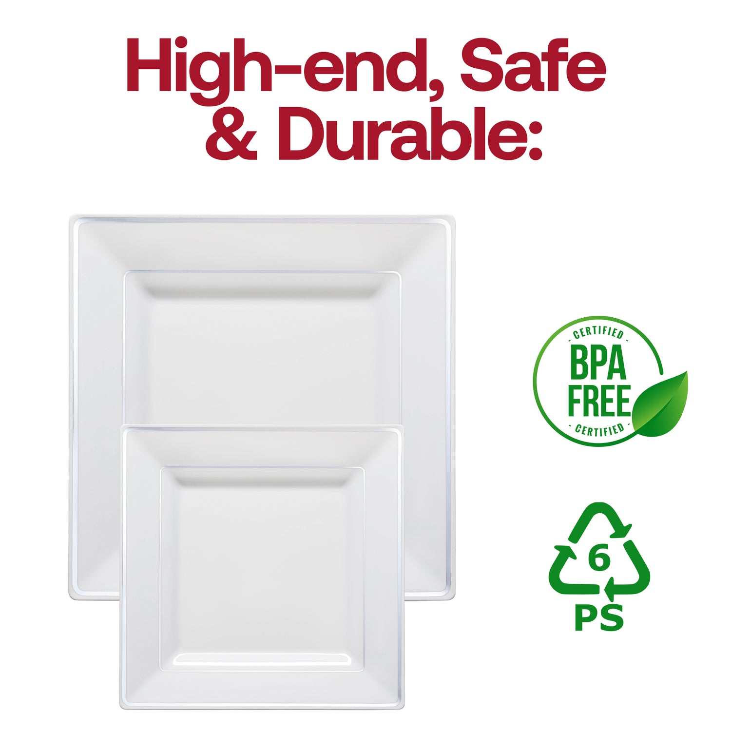 These White with Silver Square Edge Rim Disposable Plastic Dinner Plates measure 9.5 inches in size, making them roomy enough to accommodate dinner portions of any size with ease. Thanks to their superior plastic construction, they are also durable enough to support the weight of any food placed on them. In addition, their high-quality plastic is BPA free and recyclable, so it is an eco-friendly alternative to other disposable plates; when you throw them out at the end of the night, you can have peace of mind about where they will end up.