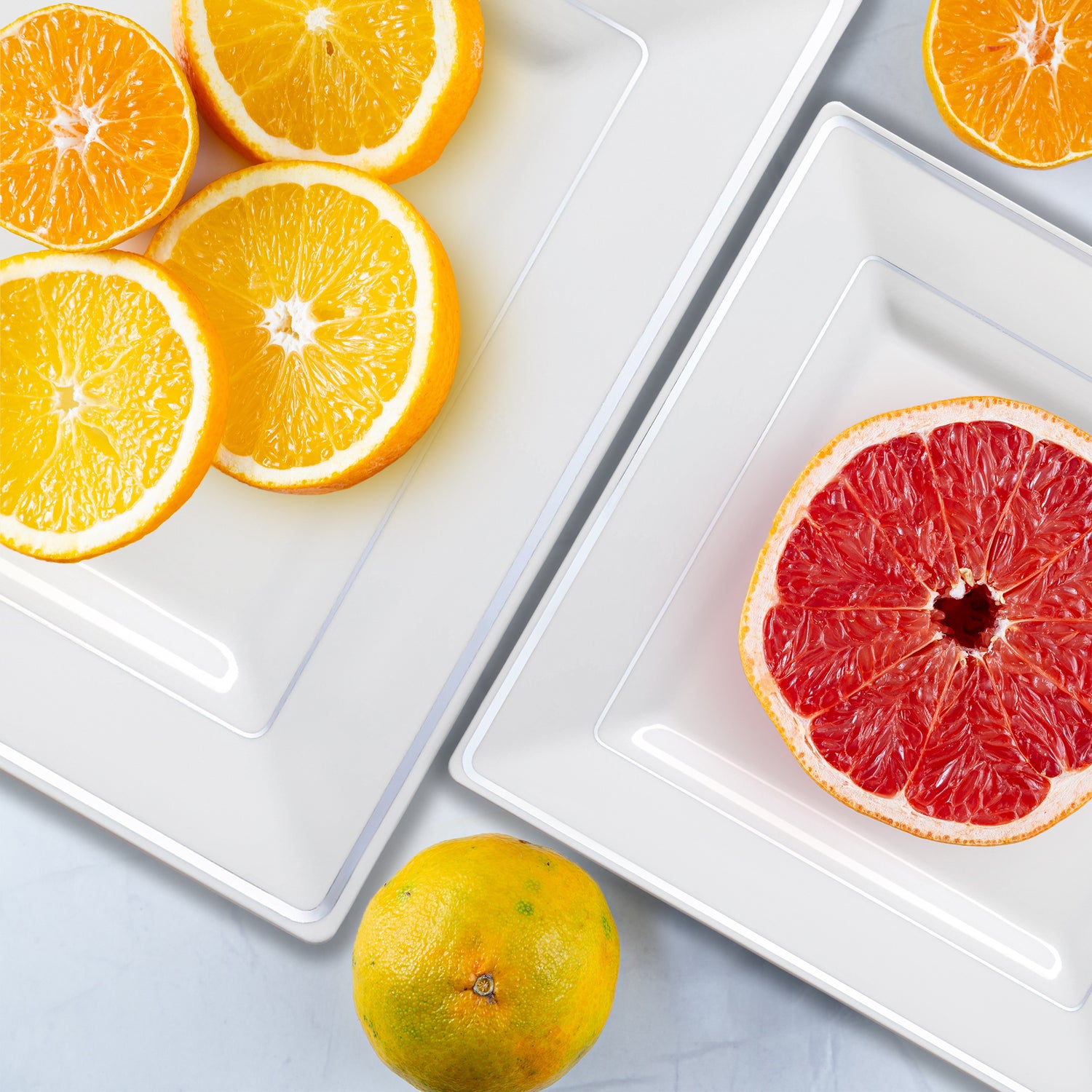 When you choose the 9.5" White with Silver Square Edge Rim Disposable Plastic Dinner Plates, you can enjoy the beauty of traditional dinner plates without all of the hassle and expense they come with. These elegant disposable dinner plates look like the real thing but can be thrown out after use. They have a crisp white color accented only by the silver rim both along the innermost and outermost edges for a subtle and stylish finishing touch. In addition, their square shape adds a decidedly modern finishing touch to the plates that will make them a memorable addition to any party, catered event, or special occasion.